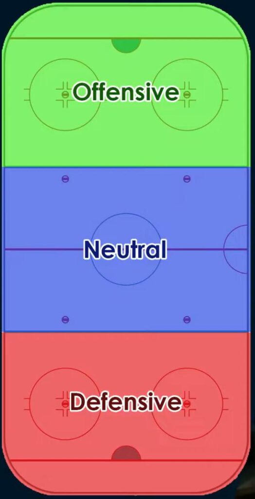 Hockey rinks are divided into three main areas, delineated by two horizontal blue lines. Here’s a brief overview of each zone along with their functions: